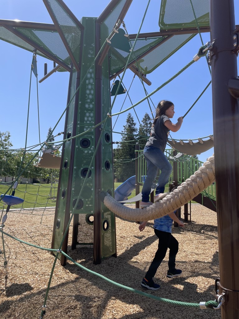 This park is so much fun for the older kids. They have so many climbing ropes and places the kids can hang on. My kids loved the spinning swings…me not so much!