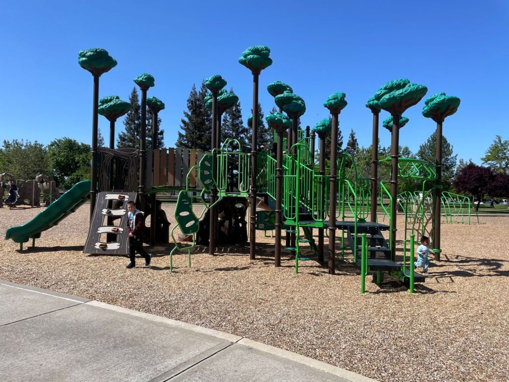 This park has more open space than playground structure so it looks kind of odd. The big kid section has swings, monkey bars and fun slides. My kids loved the rock climbing wall but I had to come save them a couple of times.