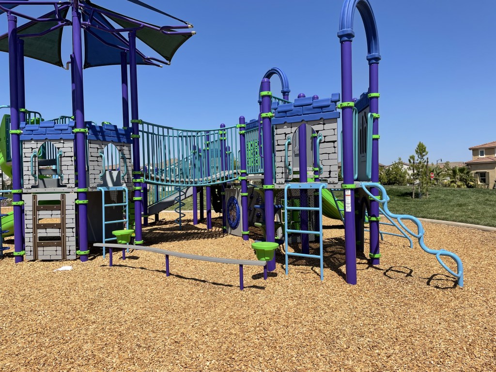 Its a cute park with a toddler and big kids playground in a castle theme. Both sides have great slides, climbing walls and monkey bars.