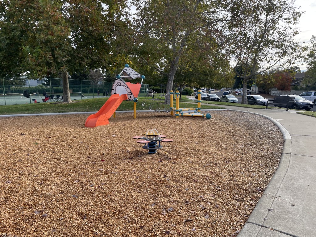 Its a cute little park with an unique treehouse and ropes to climb up. There isn’t much to the park but has tennis courts and lots of shaded trees. Downfalls are lots of tan bark, no bathrooms and not much to the playground.