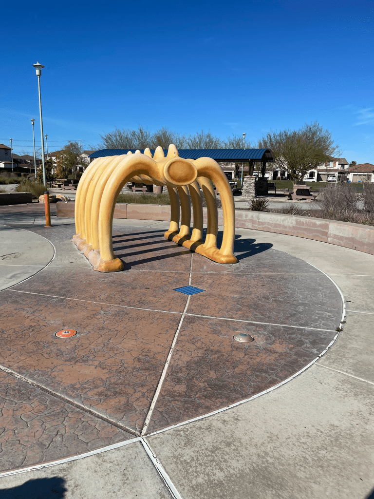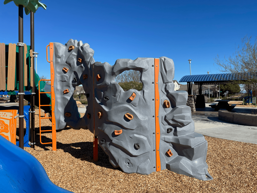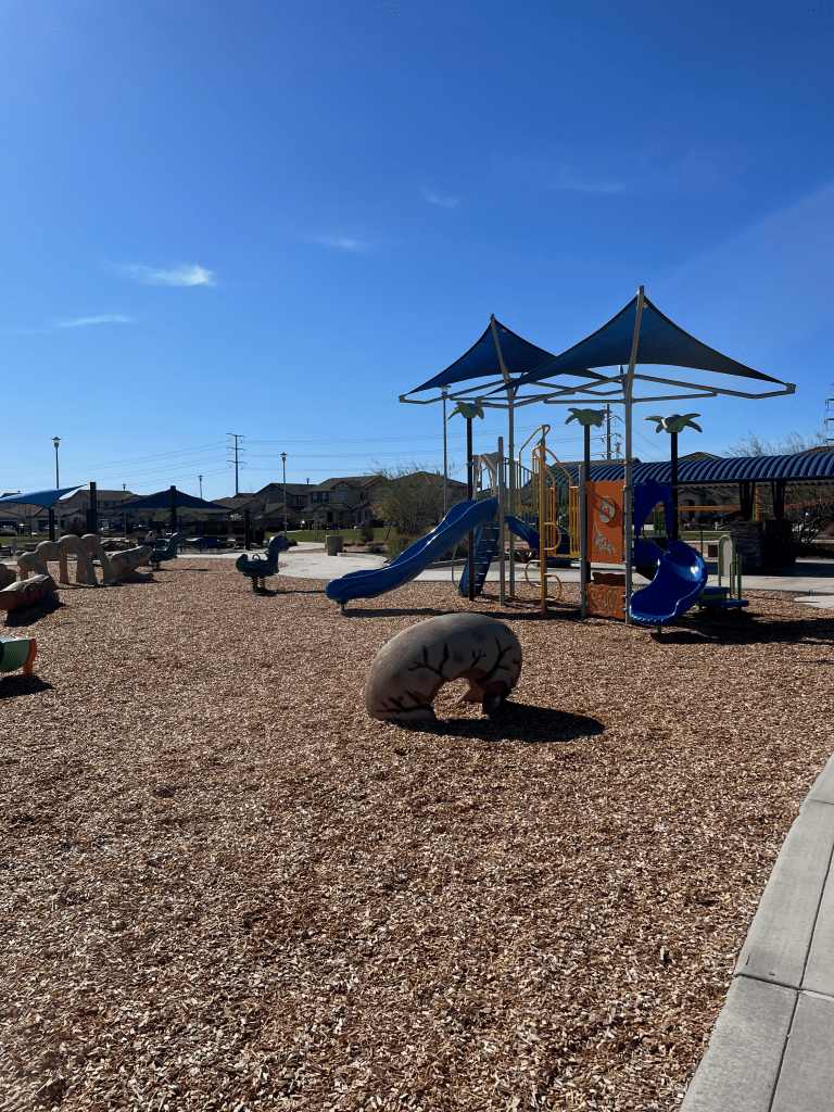 The park is large and is separated in sections. The big kid section has a zip line, climbing walls, slides, swings and monkey bars. Throughout the park you can see dinosaur fossils and bones.