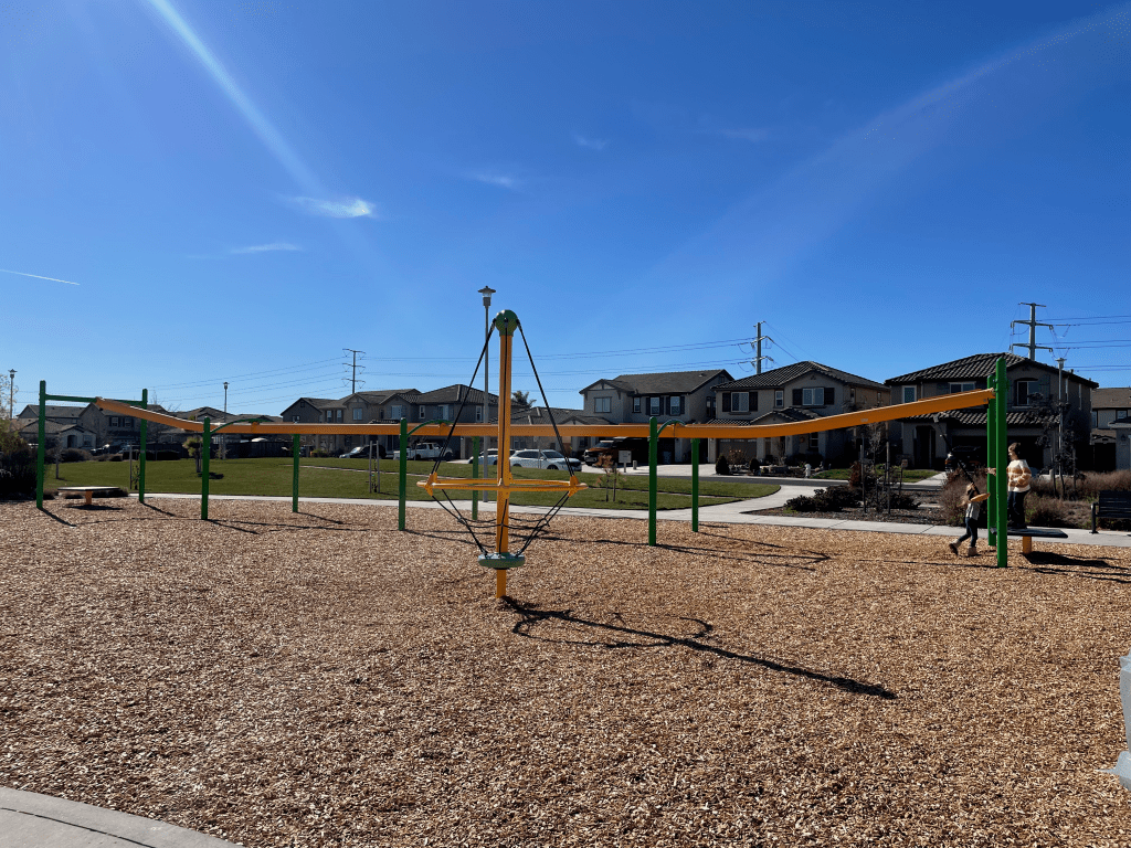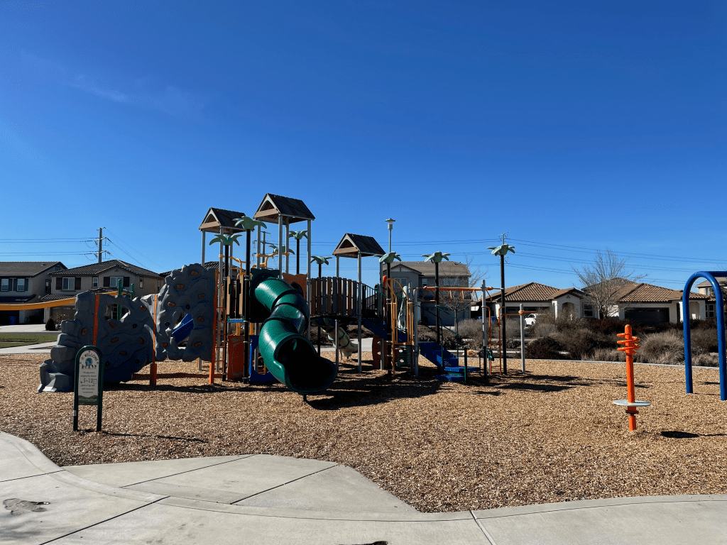 There is a shaded sand pit and small water play area. This would be a great park to have a birthday at! Tons of grass, picnic tables and even a basketball court. There are no bathrooms and no shade on the playground. If you are looking for a park for a playdate go check out George Park!