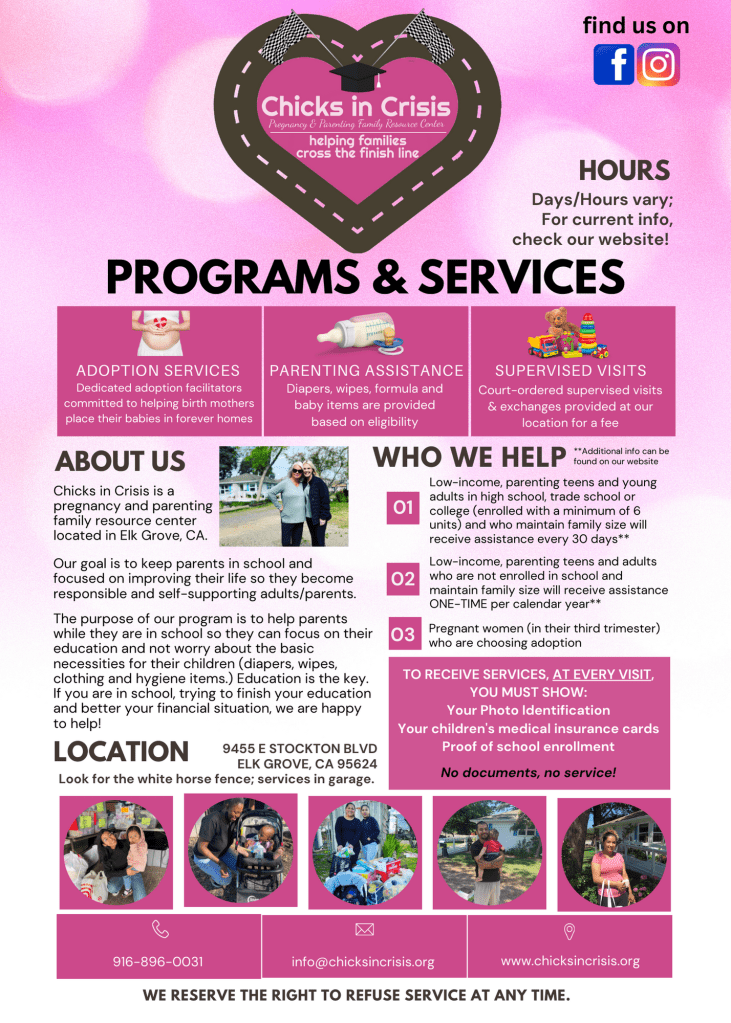 Chicks in Crisis helps parents stay in school by supplying with diapers, wipes, formula, hygiene and other items they have on hand at the time.