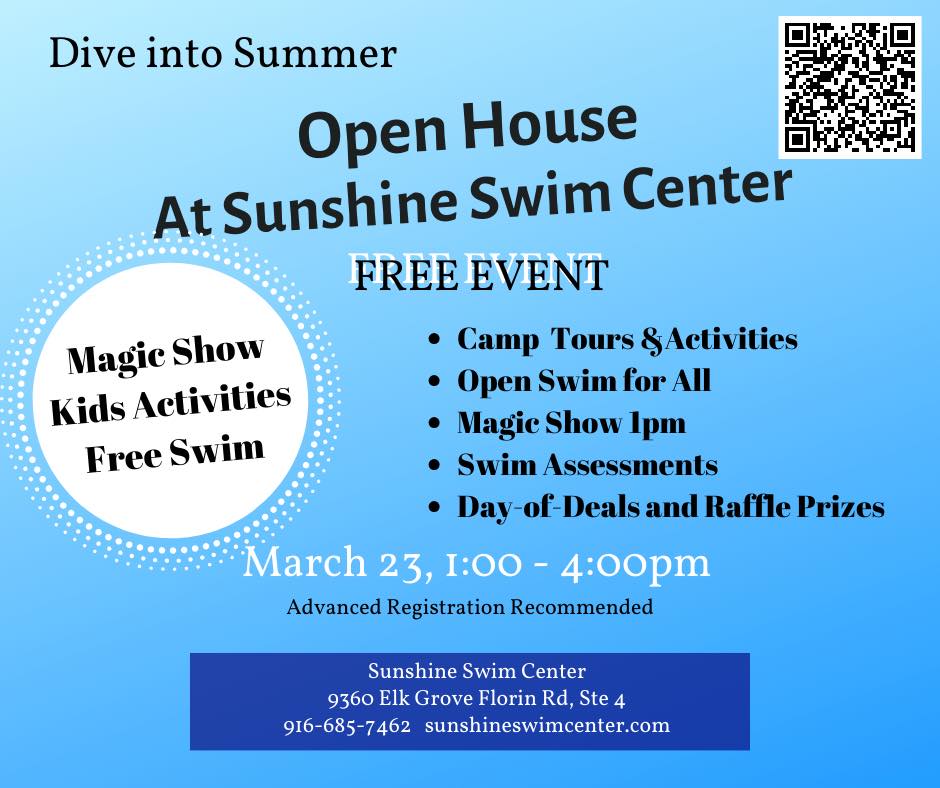 Details: Camp tours, Open Swim, Magic Show at 1:00pm, Swim Assessments, and Raffle Prizes