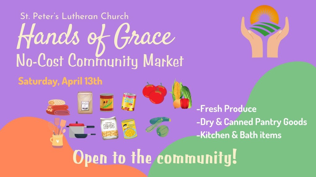Details: Open to the community for fresh produce, dry & canned pantry items, kitchen & bath items.