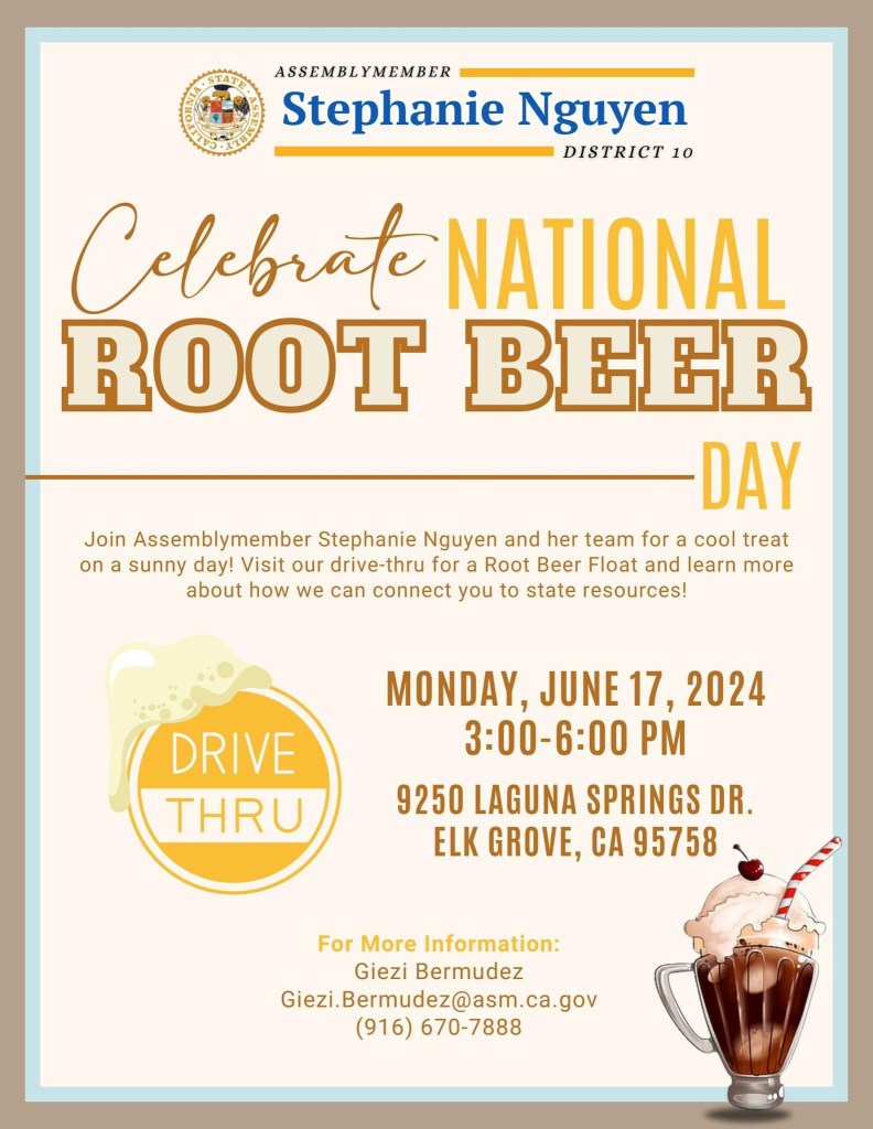 Details: Celebrate National Root Beer Day! Come grab a free one in this drive thru from Assembly Member Stephanie Nguyen
